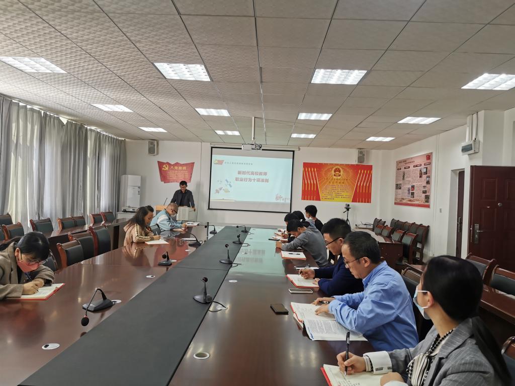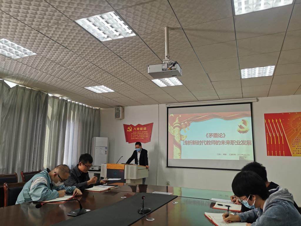高杰以《新时代高校教师职业行为十项准则》为主题,从《准则》制订的背景、意义及主要内容三个方面,结合高校违反教师《准则》的具体案例,用以提醒和警戒同志们规范教师职业行为。黄强以“《矛盾论》浅析新时代教师的未来职业发展”为主题,从高校教师职业现状浅析、高校教师职业发展中的“矛与盾”及新时代高校教师职业发展浅析等三个方面,深入浅出讲解了新时代高校教师在坚持准则的基础上如何设计职业发展与规划,如何正确处理矛盾。
