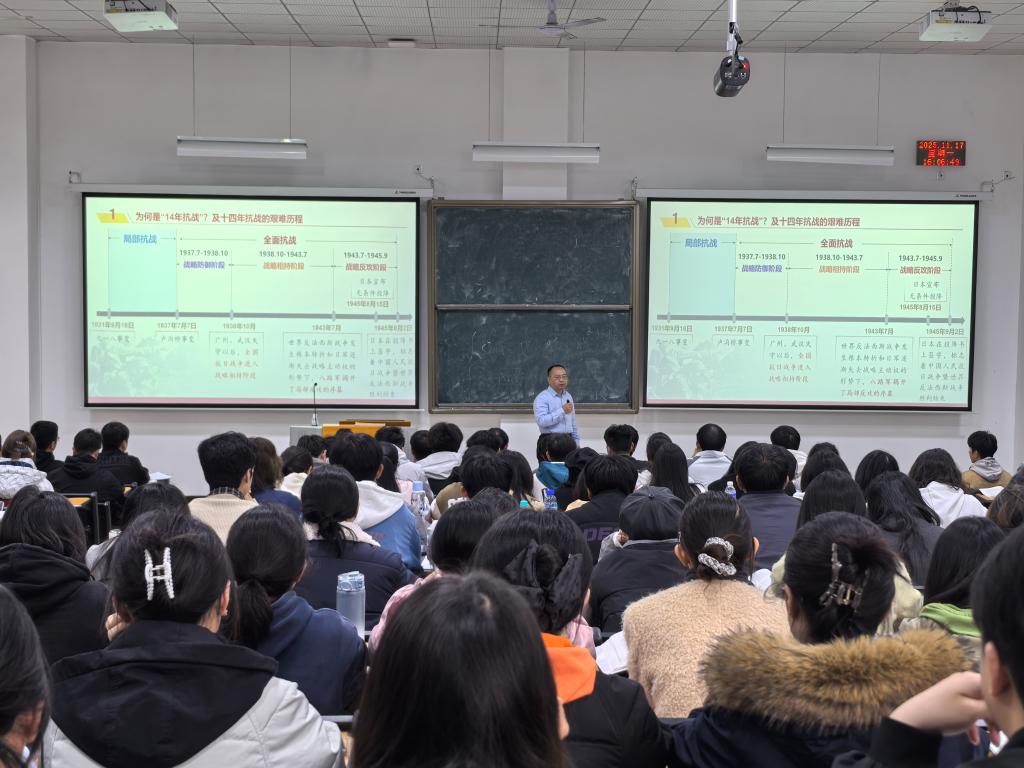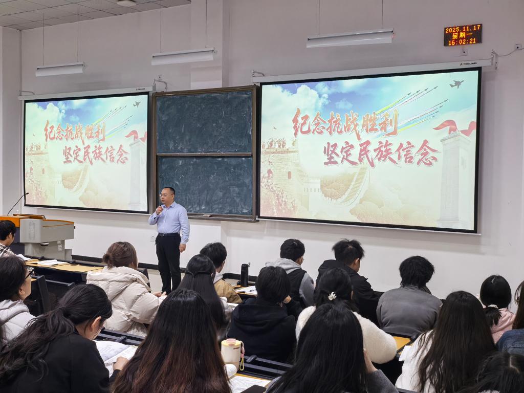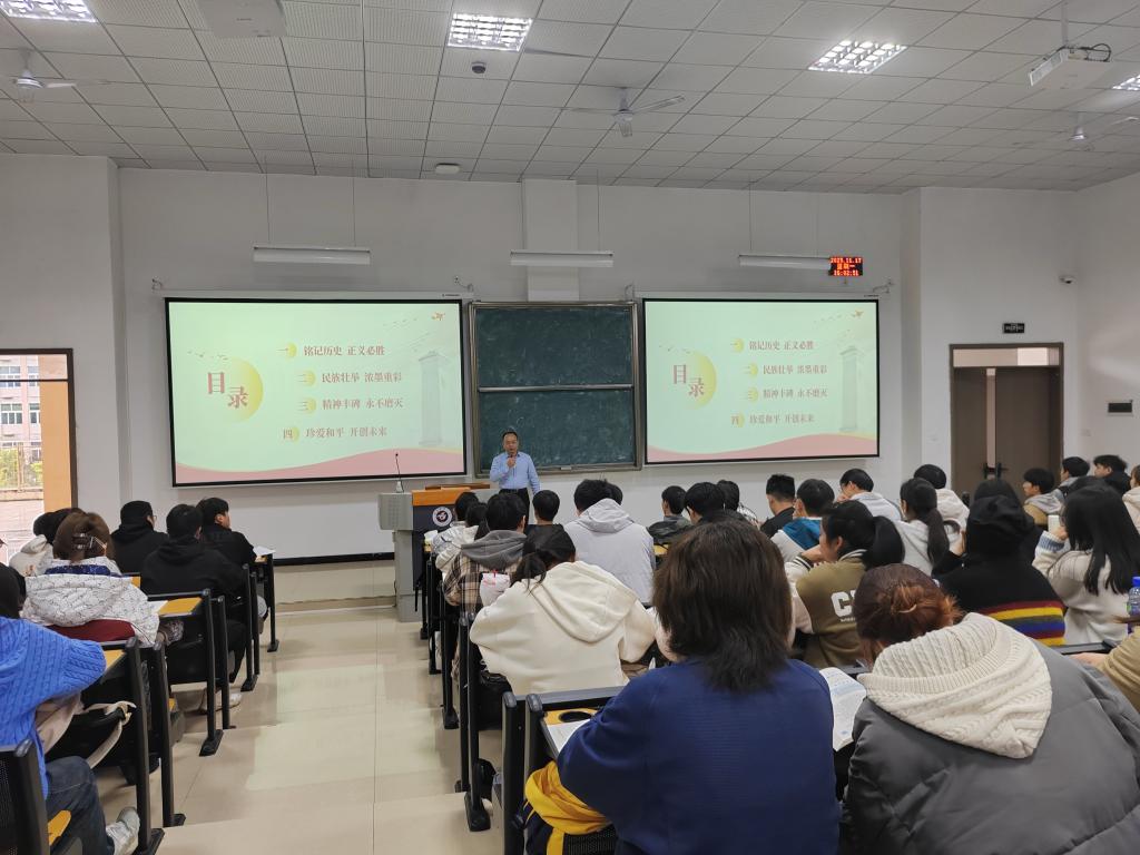 龚其海围绕“铭记历史,正义必胜、民族壮举,浓墨重彩、精神丰碑,永不磨灭及”四个方面的内容,为同员工动地讲述了中华儿女在抗战中展现的英勇事迹和丰富内涵与时代价值,引导同学们将爱国情怀转化为学习动力,为实现中华民族伟大复兴贡献力量。