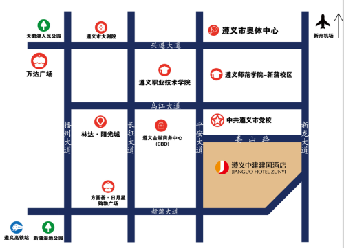 4.贵阳龙洞堡机场——中建建国酒店170km,可乘高铁到遵义高铁站。