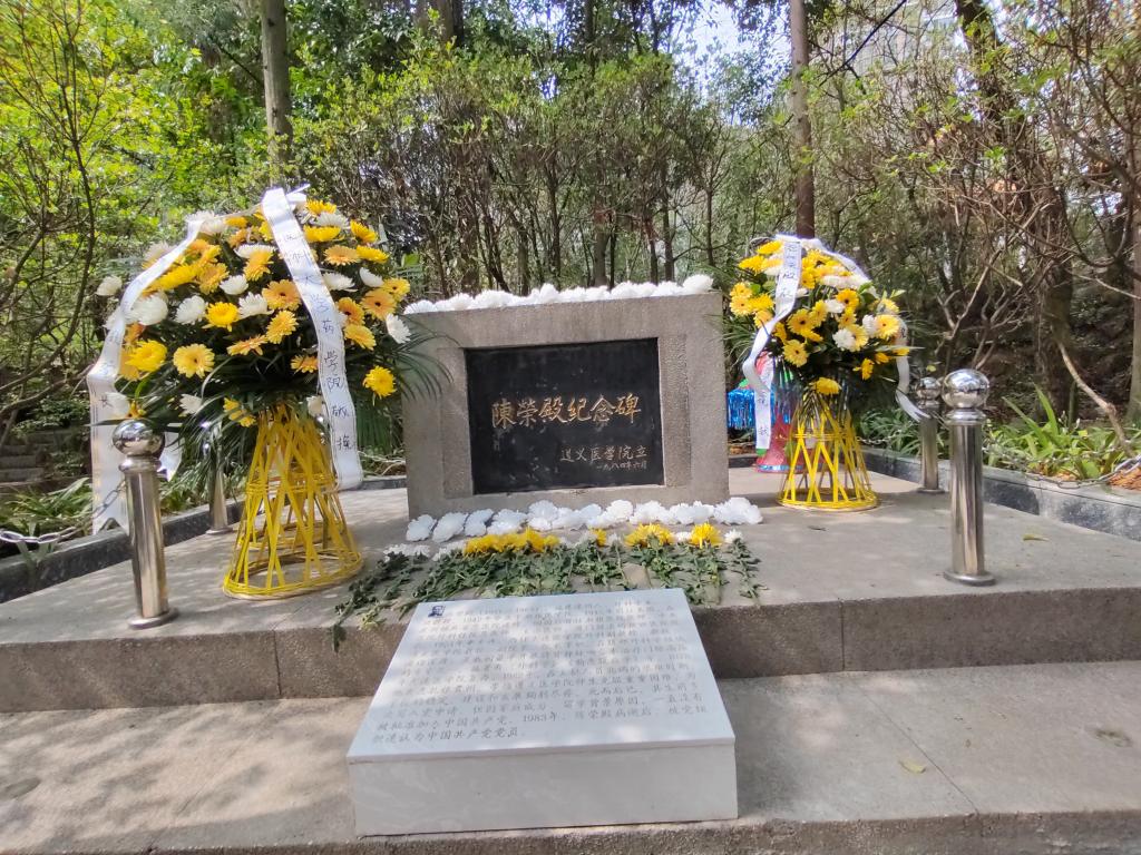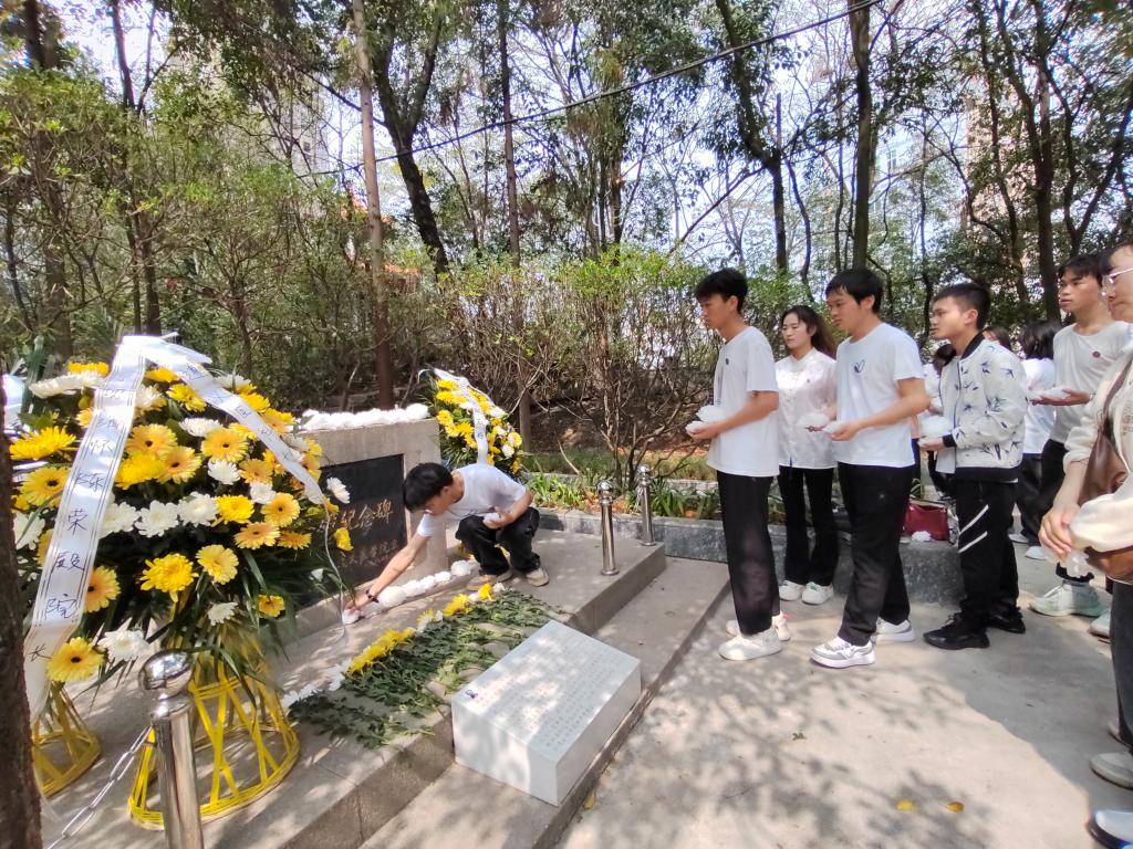 在大连路校区陈荣殿、伍律墓碑前。师生通过献花篮、理缎带、集体默哀表达了追思先贤、缅怀先辈,追忆公司先辈光辉业绩的崇敬心情。吴庆给师生讲解了两位先贤的生平事迹,感悟老一辈遵医人的艰苦奋斗和无私奉献精神。