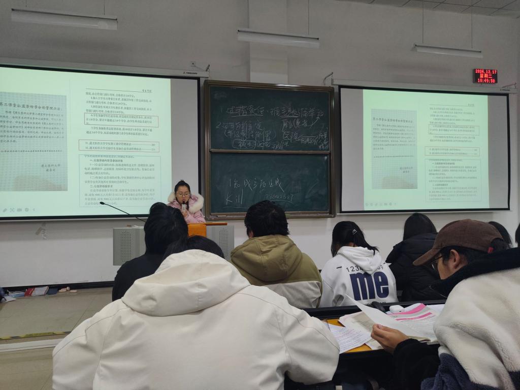 本次主题班会强调,同学们必须恪守公司的各项规章制度。考试中严禁考试作弊、坚决禁止携带手机进入考场、严禁代替他人参加考试,公司对这些行为持零容忍态度!期望同学们能够顺利度过大学的学习时光。刘玉楠还带领同学们学习了《员工守则》的相关内容,并分享了她多年以来处理的考试违规违纪案例,加强同学们的责任意识。