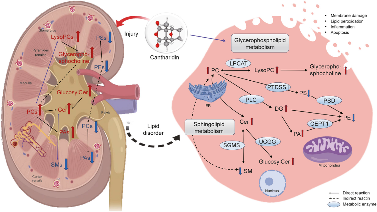斑蝥素(CTD)是大毒中药斑蝥抗肿瘤的主要活性成分,也是斑蝥及其制剂临床应用产生肾损伤的主要毒性成分。本研究创新性地联合脂质组学与空间代谢组学技术,发现口服CTD导致小鼠肾脏皮质和髓质区域磷脂代谢发生空间特异性紊乱,鉴定出232种差异脂质,表现为甘油磷脂代谢在皮质和髓质均被显著激活,而鞘脂代谢在皮质区域被特异性抑制。LysoPC(16:0)被确定为介导CTD肾损伤的关键脂质分子,其在肾脏积累加剧肾小管细胞死亡,这种作用可能与CTD抑制LPCAT 1和激活CEPT1驱动LysoPC(16:0)积累。