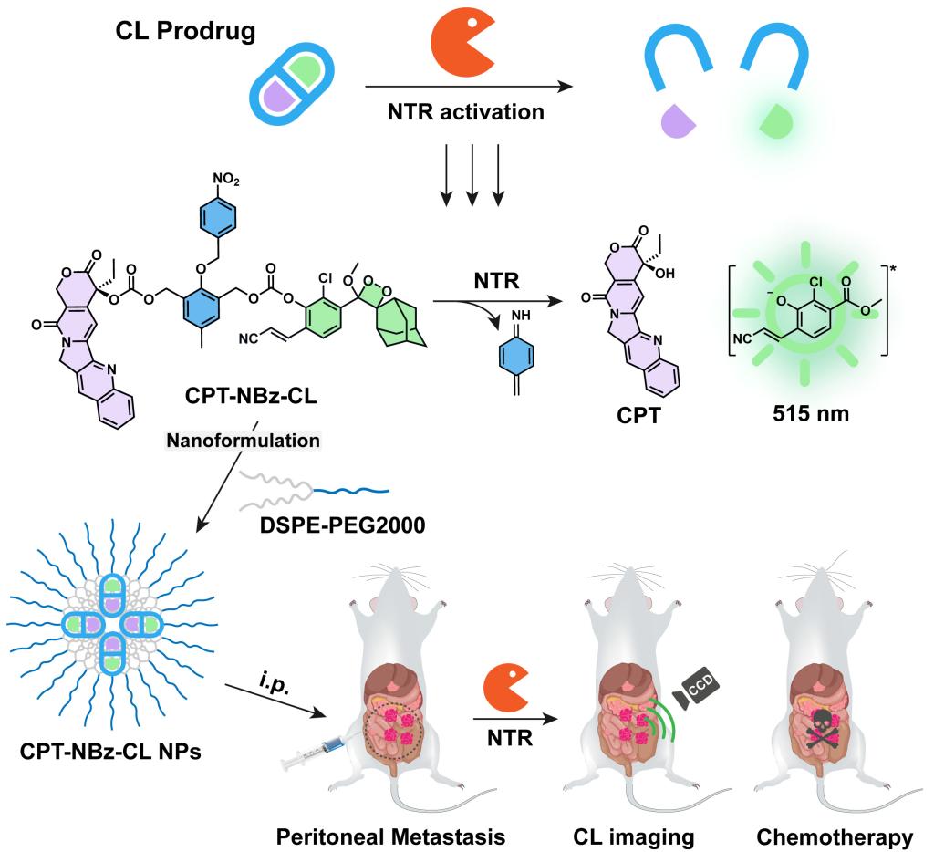 该研究通过精巧的分子设计,构建了一种新型硝基还原酶(NTR)激活的化学发光前药CPT-NBz-CL,巧妙地将抗癌药物喜树碱(CPT)、缺氧响应基团4-硝基苄基(NBz)和化学发光报告基团通过自催化裂解连接子整合为单一分子实体。该前药在常氧条件下保持稳定,细胞毒性被有效屏蔽;而在缺氧的肿瘤微环境中,高表达的NTR催化NBz基团还原,触发自催化裂解反应,同时释放活性药物CPT并产生强烈的化学发光信号,实现了“药物释放-信号产生”的精确同步。为克服前药水溶性差的问题,研究团队进一步将其制备成纳米制剂(CPT-NBz-CL NPs),显著改善了生物相容性和体内递送效果。体外实验证明,该纳米制剂具有显著的缺氧选择性细胞毒性,并能在缺氧环境下发出化学发光。在腹膜转移瘤小鼠模型中,CPT-NBz-CL NPs通过体内化学发光成像,成功描绘出缺氧肿瘤区域。更重要的是,其抗肿瘤效果与游离CPT相当,但显著降低了原药的全身毒性。该策略为腹膜转移等恶性肿瘤的精准诊疗提供了新的解决方案。