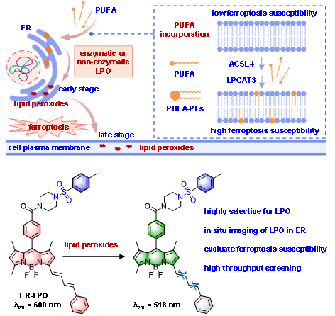评估细胞对铁死亡的敏感性(由脂质过氧化LPO驱动的程序性细胞死亡过程),对于理解相关疾病发病机制及开发靶向治疗策略至关重要。为此,公司袁泽利教授课题组与中国科公司化学所马会民研究员课题组合作。依据内质网(ER)是铁死亡过程中LPO最早积累的位点,提出了通过监测ER中的LPO新策略。