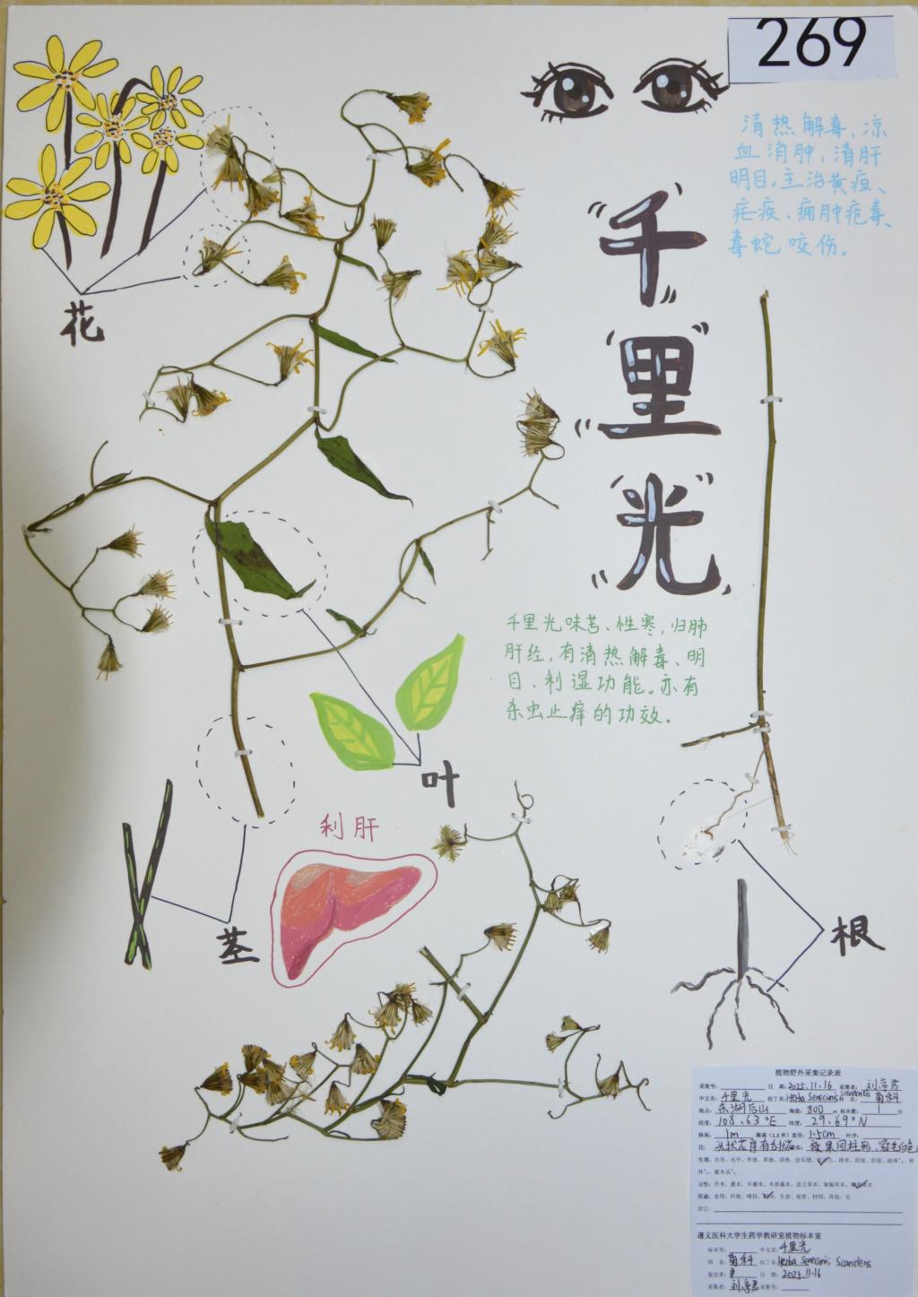大赛以“创新·实践·融合”为主题,鼓励参赛者围绕药用植物标本的制作展开创意实践,将自然植物转化为兼具科研价值与艺术美感的精美标本。参赛部分作品完整呈现植物的生长形态,有的则聚焦花瓣、叶脉等微观结构,更有作品融入场景设计与手绘元素,通过创意排版与艺术加工,拓展了标本的表现形式,充分展现了同学们的审美情趣与综合实践能力。